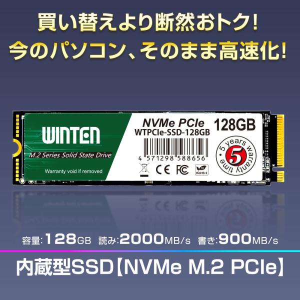 WINTEN 内蔵SSD 128GB SSD M.2 5年保証 ドライバー付 NVMe PCIe Gen3×4 M.2 Type2280 3D NANDフラッシュ搭載 M Key エラー訂正 省電力 WTPCIe-SSD-128GB 6174