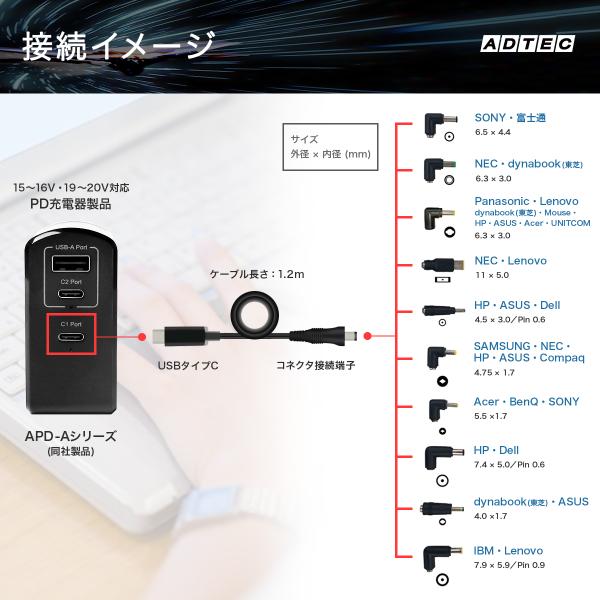 アドテック ノートパソコン用 マルチプラグケーブル eMarker搭載 1.2m PD充電 95W対応(USB Type-C/10種類コネクタ付属) APC-A095CM-V2