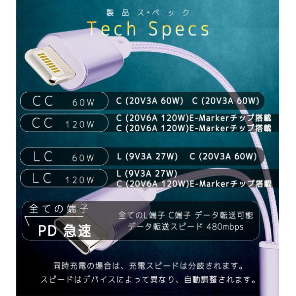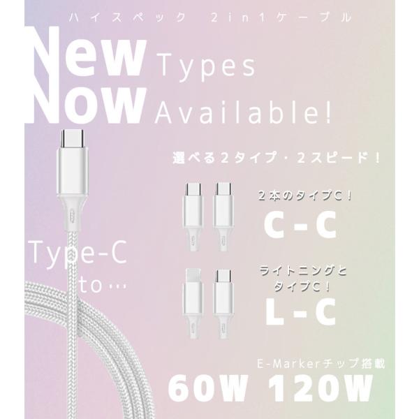 2in1 充電 ケーブル 60-120w 急速 充電器 急速充電 マルチ充電ケーブル iPhone ケーブル 2in1ケーブル microUSB type-c ライトニング タイプcケーブル