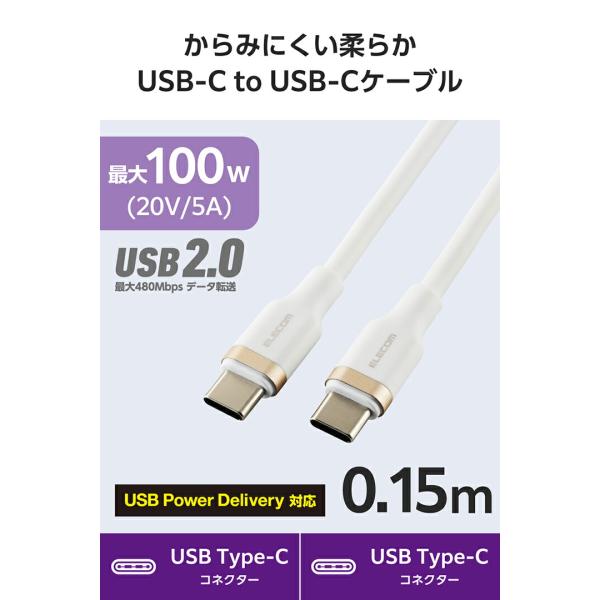 エレコム USB Type-C - USB Type-Cケーブル USB2.0 なめらか USB Power Delivery対応 100W 0.15m ホワイト MPA-CCECSS015WH