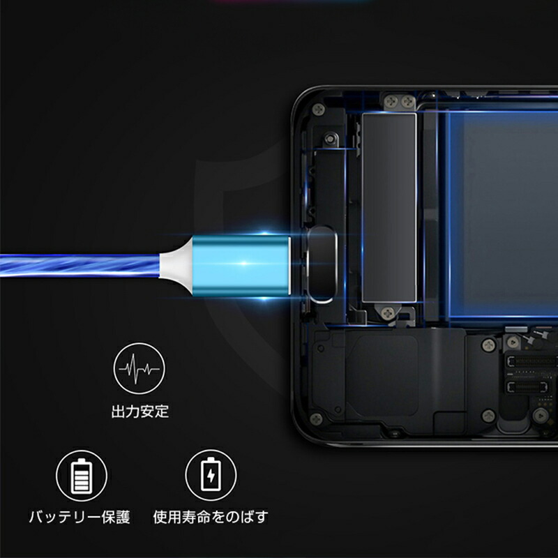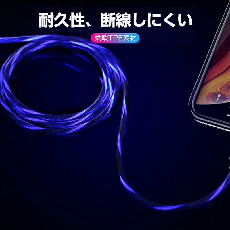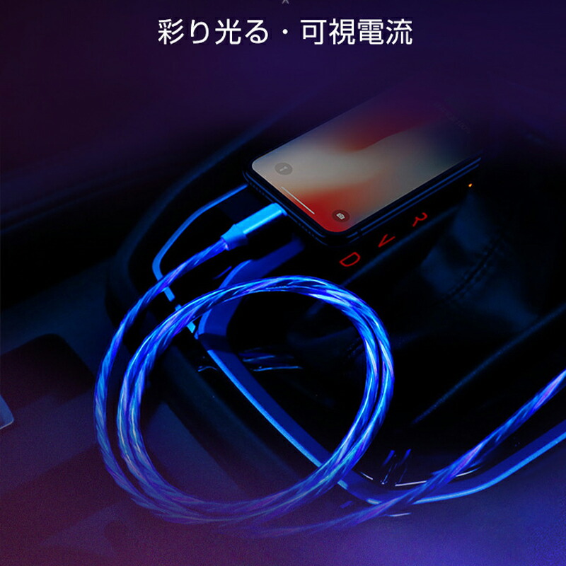 光る充電ケーブル USB急速充電ケーブル iPhone Android Type-C 光る充電ケーブル データ転送 断線防止 ブルー ピンク グリーン ホワイト 送料無料