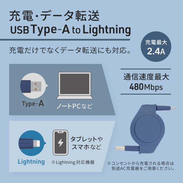 ライトニングケーブル iphone 巻き取り 1.2m Type-A to Lightning 充電 データ転送 アースカラー