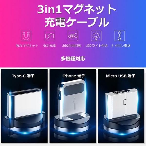 3in1マグネット式充電ケーブル(iPhone+Type-C+microUSB) 急速充電 Lightning×1個+Type-C×1個+micro×1個+ケーブル×1本 スマホ 充電器 1m