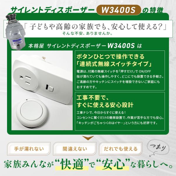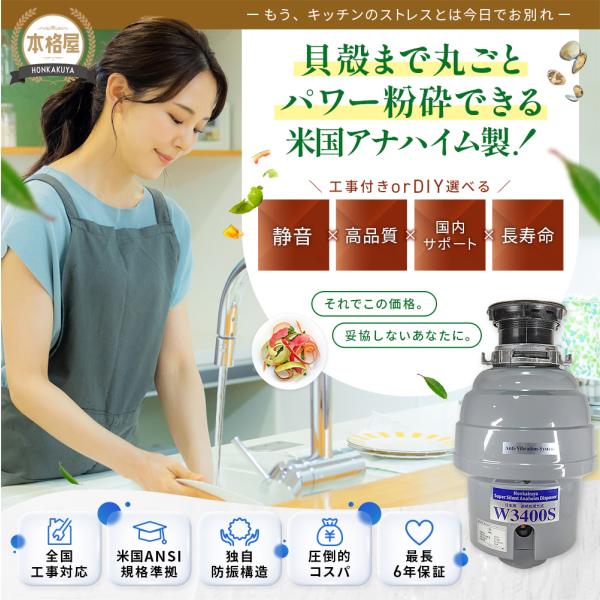 500円OFFクーポン 期間・台数限定配布中!アナハイムサイレントディスポーザー W3400S 取付部品付 連続式 防振あり 保証5年 即日出荷