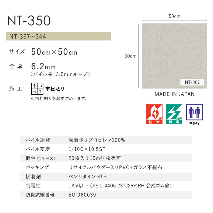 タイルカーペット 50×50 サンゲツ nt350 NT-350(NT-367〜344) 厚み6.2mm 枚売り