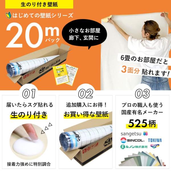壁紙 のりつき「 一般壁紙 ミミあり」 のり付き クロス 壁紙 おしゃれ 選べる525柄「生のり付き壁紙だけ 20 mパック」+マニュアル 壁紙 無地 張り替え DIY