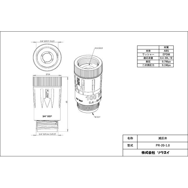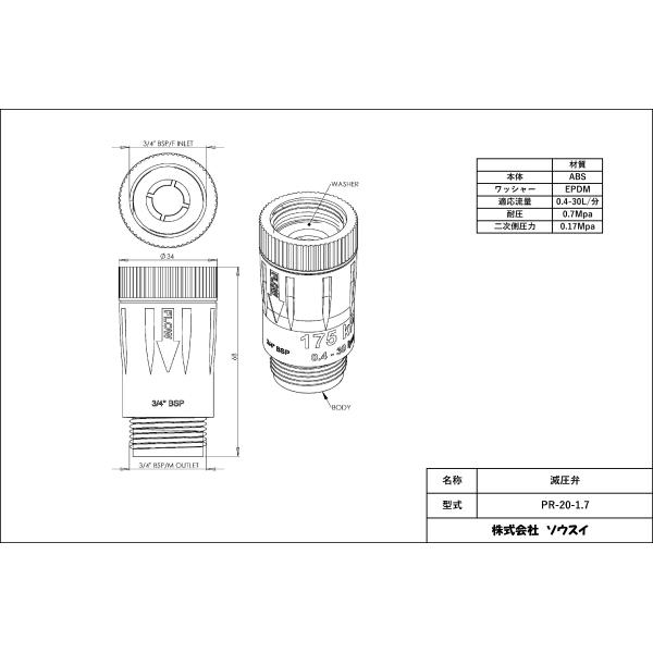 減圧弁 PR-20 20mm(3/4”)二次側圧力固定タイプ 少ない水量 低流量で使用可能 定圧弁 二次側圧力 0.1Mpa 0.17Mpa 入口:3/4” めすねじ 出口:3/4”おすねじ