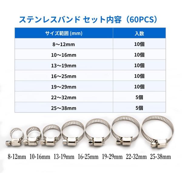 ホースバンド ステンレス 7種60個セット 8〜38mm クランプ 配管 自動車 バイク DIY 修理 固定