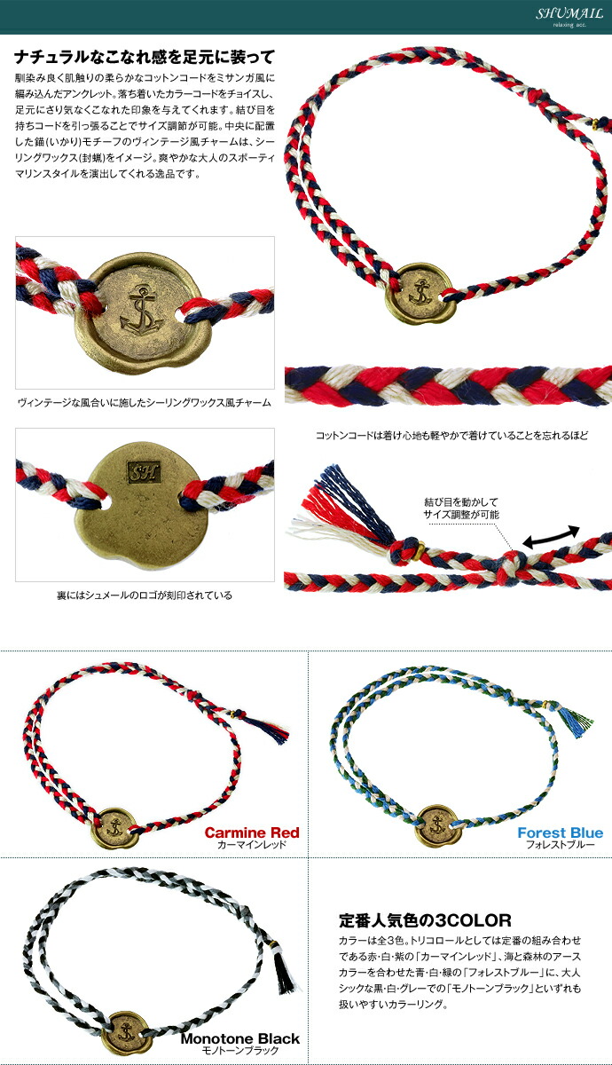 ミサンガ アンクレット メンズ 編み込み マリン ヴィンテージ調 アンティーク風 アクセサリー ブランド SHUMAIL レディース 足首 カップルお揃い フリーサイズ