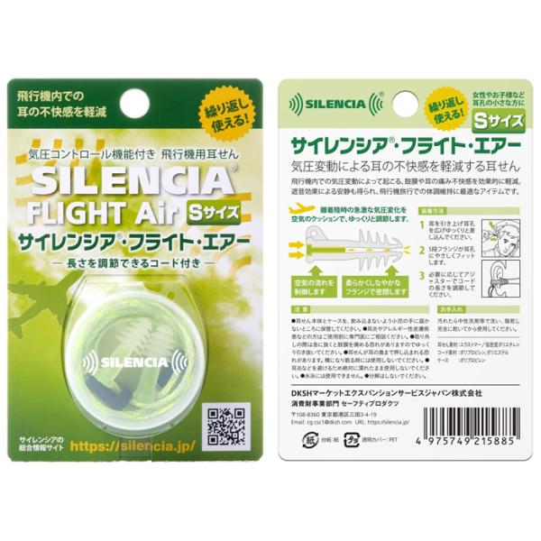 飛行機で耳が痛くならない耳栓 サイレンシア フライトエアー コード付き Sサイズ 女性用 子ども用