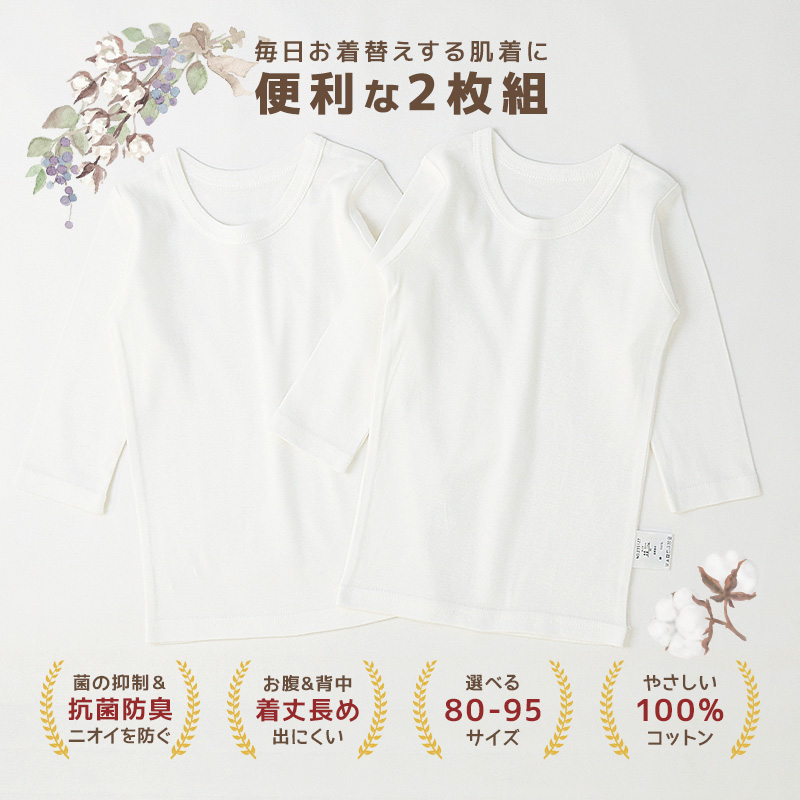 ベビー 肌着 白 無地 長袖Tシャツ 2枚組 80 90 95 フライス 抗菌防臭 綿100% 男の子 女の子 子供肌着 ベビーウェア ホワイト 下着 子供服 インナー コットン
