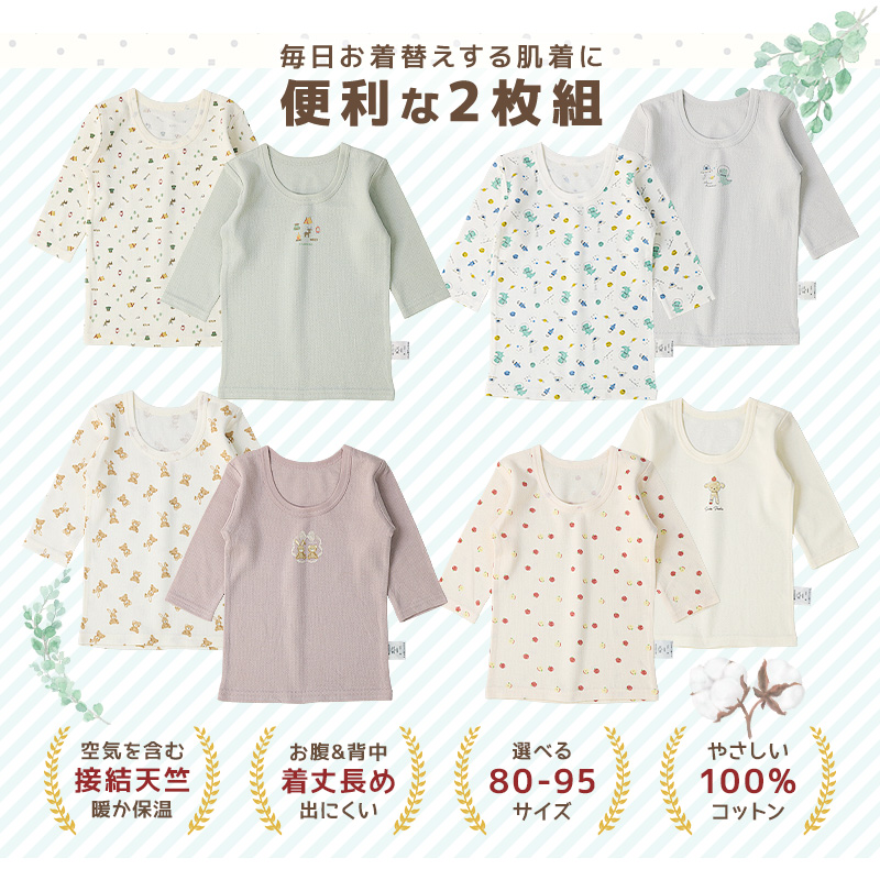 ベビー 肌着 長袖Tシャツ 2枚組 綿100% 下着 80 90 95 接結天竺 吸湿保温 キッズ インナー 子供肌着 男の子 女の子 くま うさぎ 2枚セット 新生児 かわいい