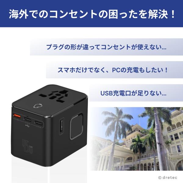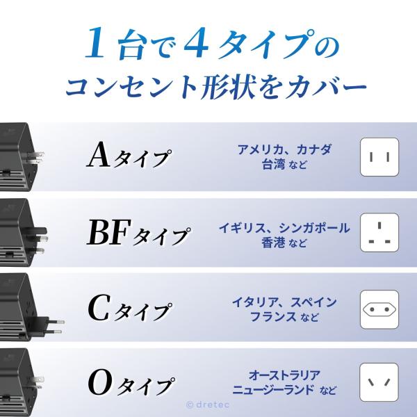 ドリテック 公式 電源変換プラグ 海外旅行用 トラベルアダプター USB Type-C Type-A PD45W対応 5ポート搭載 200カ国対応 5ポート 充電器 出張 留学 旅行 AD-101