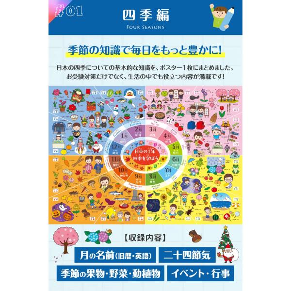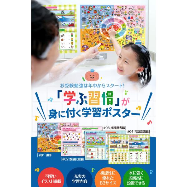 【送料無料】小学校受験 お風呂ポスター 知育 モンテッソーリ 【学ぶ習慣が身に付く!シリーズ】ルーティン博士の学習塾(4枚セット)