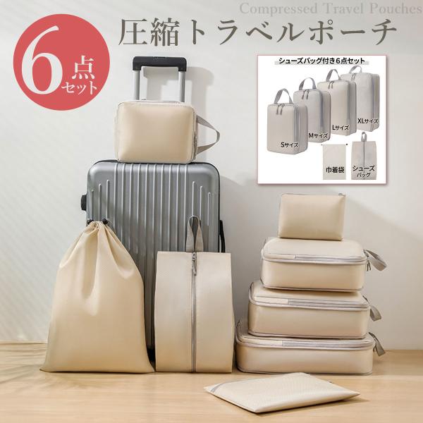 トラベルポーチ 6点セット シューズバッグ 旅行用圧縮袋 圧縮バッグ 衣類圧縮 収納ポーチ ファスナー圧縮 衣類スペース 軽量 出張
