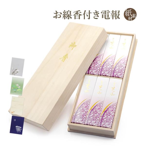 贈答用 線香 「銘香芝山」 紙素材カード電報セット 弔電 葬儀 お悔やみ お供え 何を送る 日本香堂 桐箱 進物用 ギフト 法事 お彼岸 春彼岸 お見舞い