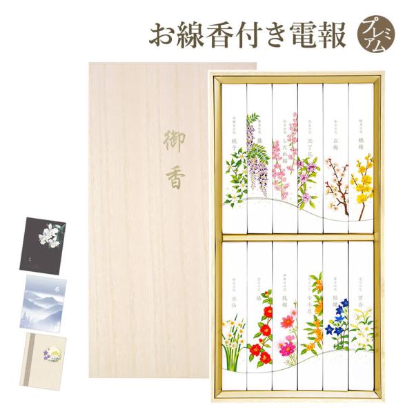 線香 「名香 月の花 桐箱 12種入」 プレミアムカード電報セット 弔電 葬儀 お悔やみ お供え カメヤマ 進物用 贈答用 ギフト お彼岸 春彼岸 お見舞い