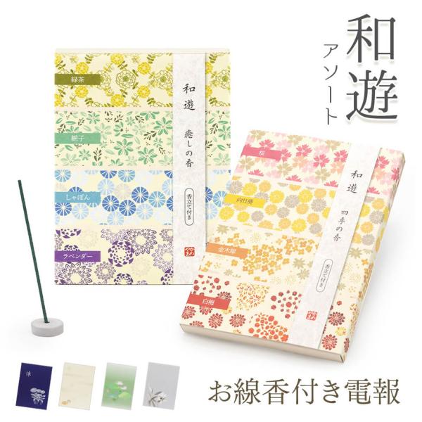 線香 ギフト「和遊アソート」癒しの香 四季の香 紙素材カード電報セット 弔電 葬儀 お悔やみ お供え 進物用 法事 お彼岸 春彼岸 お見舞い 線香立て
