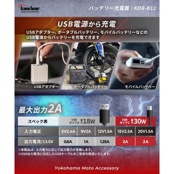 バイク バッテリー充電器 USB 入力 12V バッテリー チャージャー 充電器 2A メンテナンス充電機能付き スマートバッテリーチャージャー バッテリー充電 KDR-B12