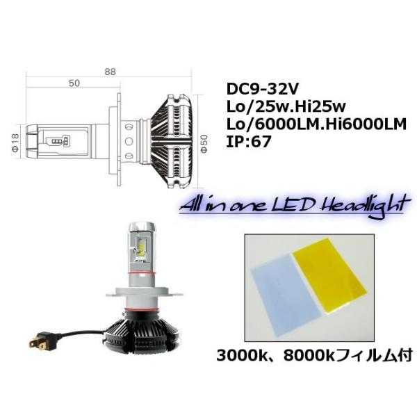 バイク用 12v24v兼用/H4 LEDヘッドライト/X3型/発光色変更可能/Hi-Lo切替/1灯/6000LM・50w級
