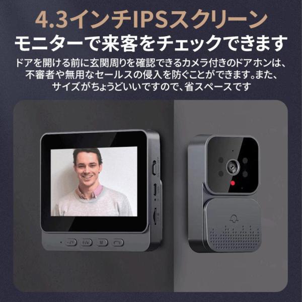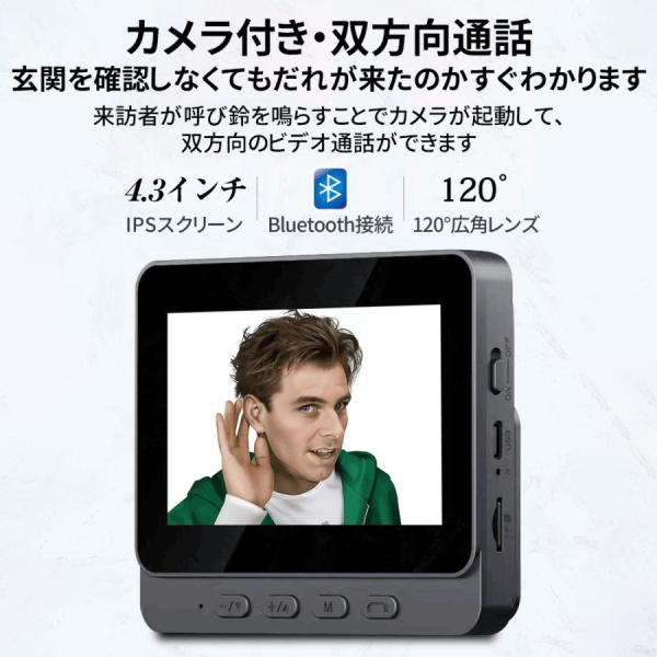 インターホン 無線 ワイヤレス カメラ付き ドアホン 120°広角 自動録画 双方向通話 4.3inch大画面 通話 WIFI 工事不要 モニター付き IP65防水