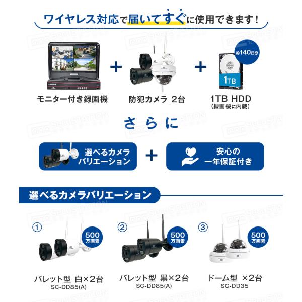 防犯カメラ 屋外 セット 家庭用 ワイヤレス wifi カメラ2台 モニター付き HDD付き LED防犯灯付き 赤外線モード スマホ遠隔監視 10台まで ネット環境不要 DR85