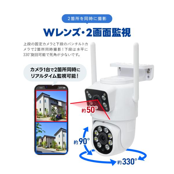 防犯カメラ Wレンズ 400万 屋外 Wi-Fi パンチルト SDカード録画 監視カメラ ワイヤレス 屋外 スマホ