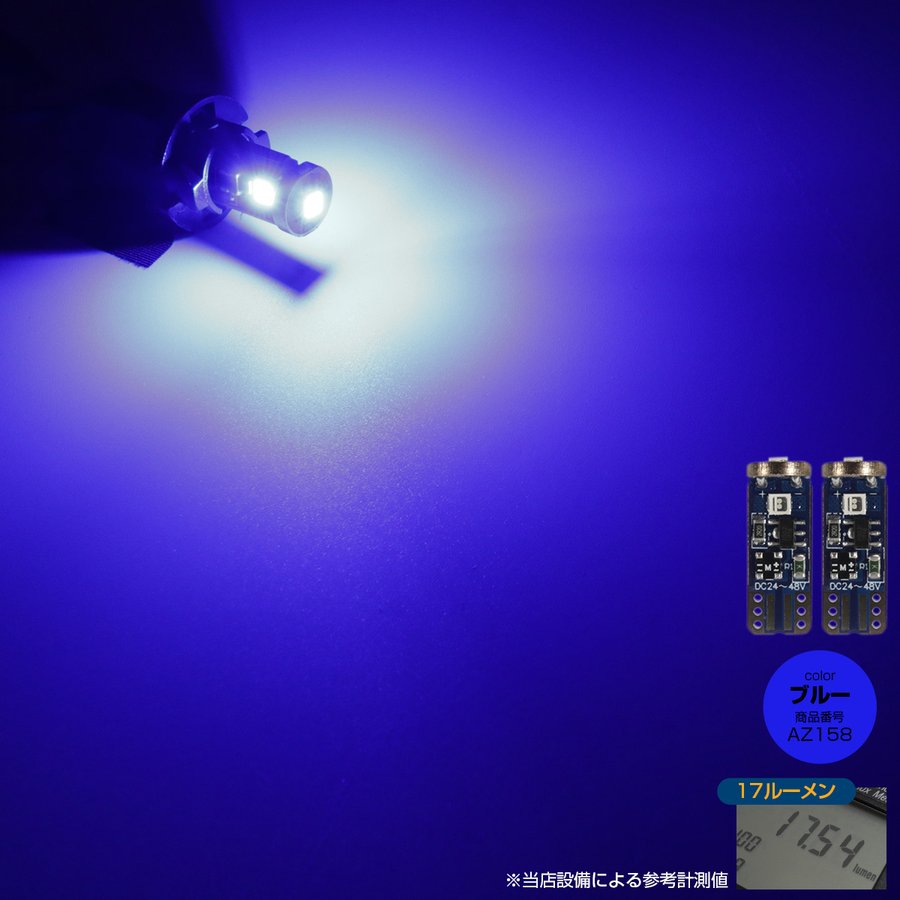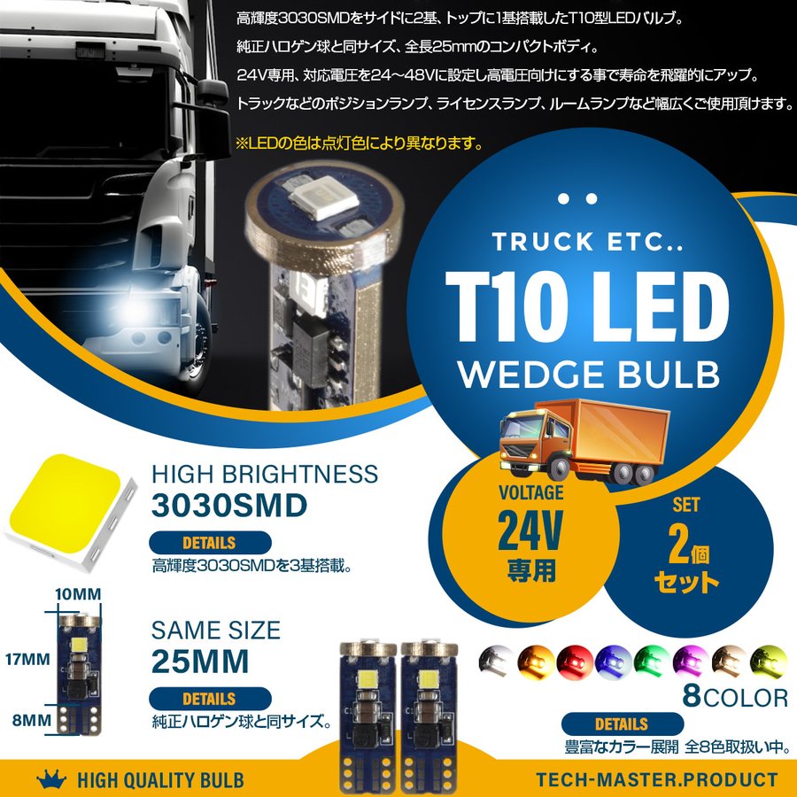 24V専用 T10 LED ウェッジ バルブ 2個セット 高輝度 3SMD搭載 小型 ホワイト/アンバー/レッド/ブルー/グリーン/パープル/電球色/レモンイエロー