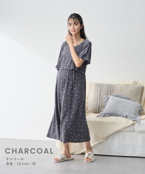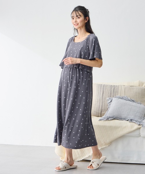 マタニティ リブハート柄プリントワンピースパジャマ(産前・産後対応 マタニティ&授乳服 ルームウェア)