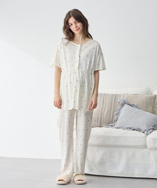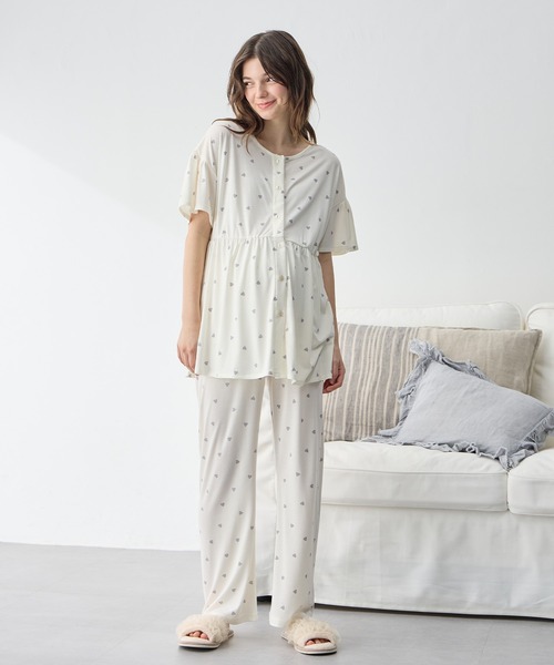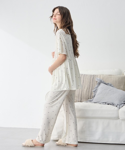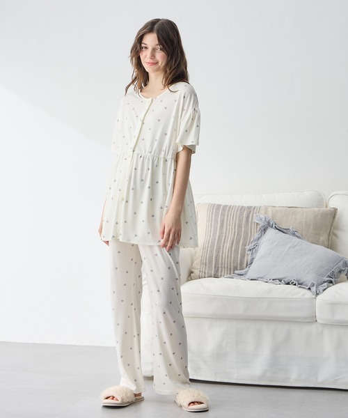 マタニティ 接触冷感ハート柄パジャマ(産前・産後対応 マタニティ&授乳服 ルームウェア 上下セット)
