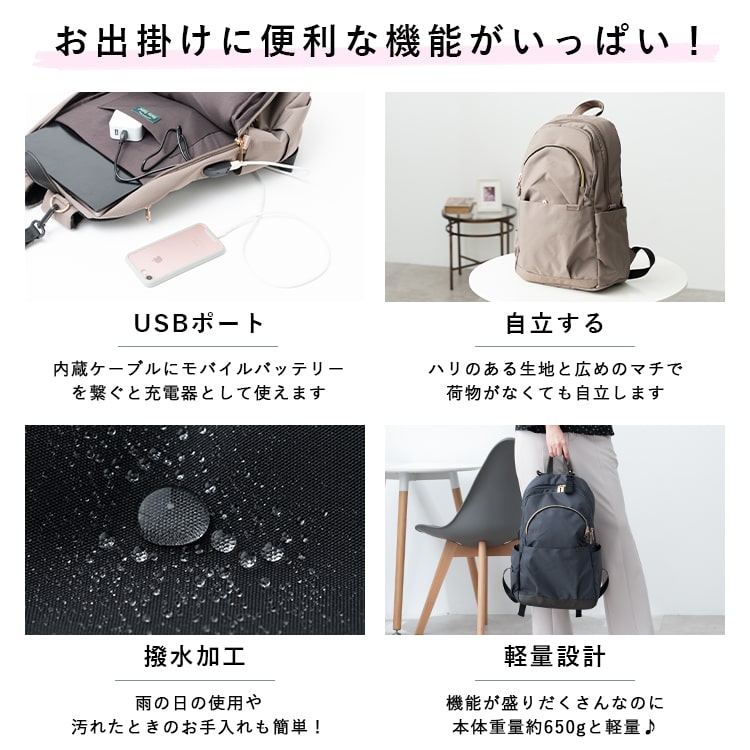 リュック レディース マザーズバッグ a4 大容量 軽量 撥水 自立 バギーフック usbポート付き 通勤 通学 pc ギフト