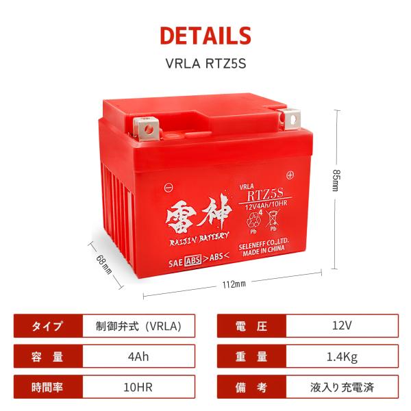バイク バッテリー YTZ5S 互換 RTZ5S 雷神バッテリー 12V 4Ah 高性能 シールド型 液入り充電済 バイク用 バッテリー RTZ5S TTZ5SL GTZ5S