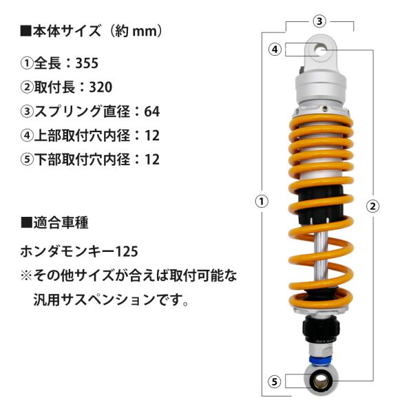 バイク 汎用 320mm リアサスペンション 左右セット イエロー スプリング リアショック リアサス 外装 カスタムパーツ モンキー 125