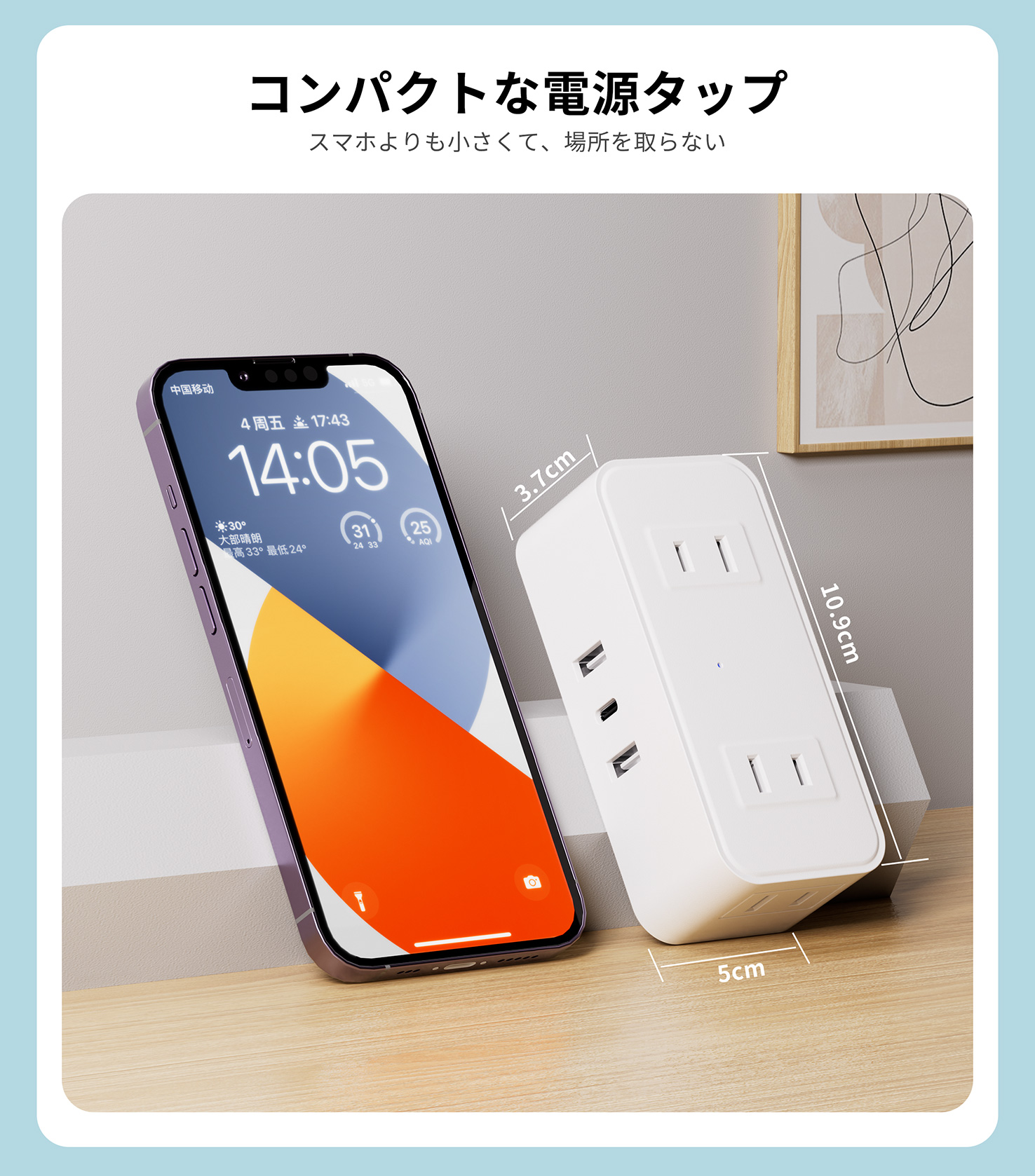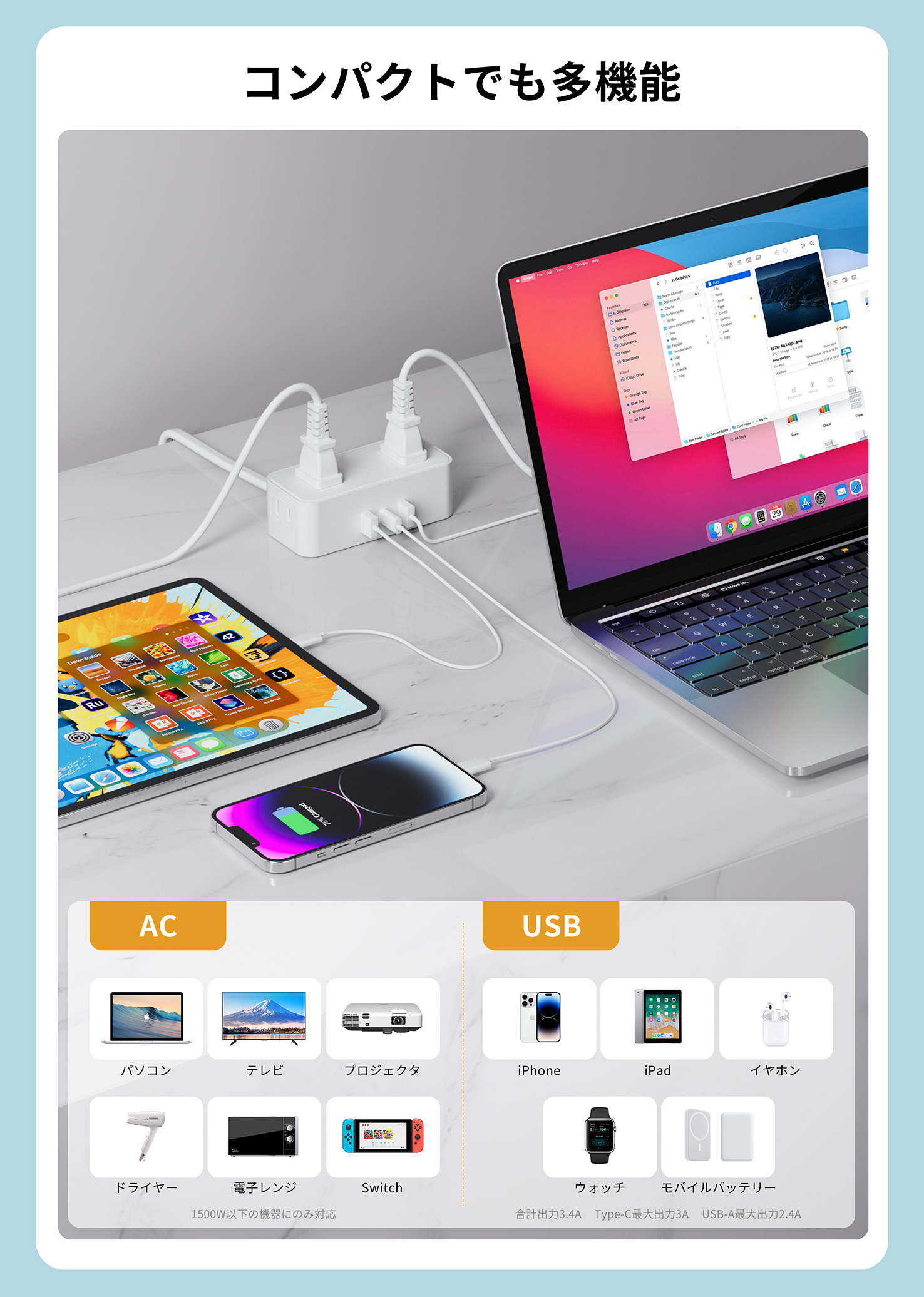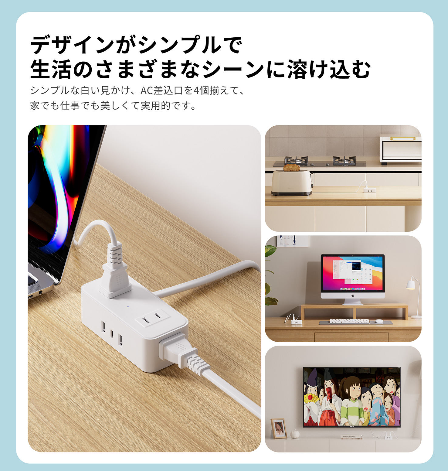 電源タップ 延長コード 2m 4個ac 2usb付き USB 1type-c コンセント スイッチ付き usb-c マルチ 延長ケーブル 急速充電 おしゃれ スイングプラグ 壁掛け