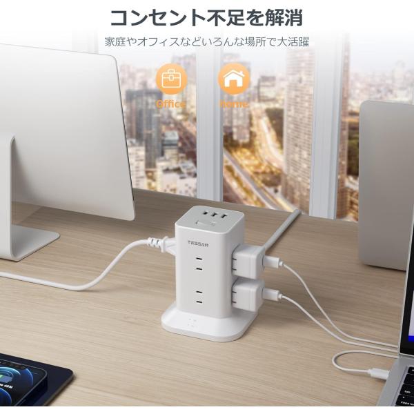 タワー型 電源タップ AC8口 USB-A2口 USB-C1口 雷ガード付 コード長 2m TPS04-JP-C TESSAN