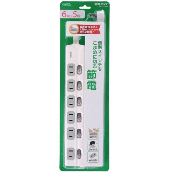 5m延長コード 節電タップ 6個口 5m ohm001978 個別スイッチ付 (00-1978 HS-T1978)