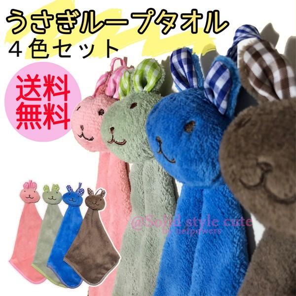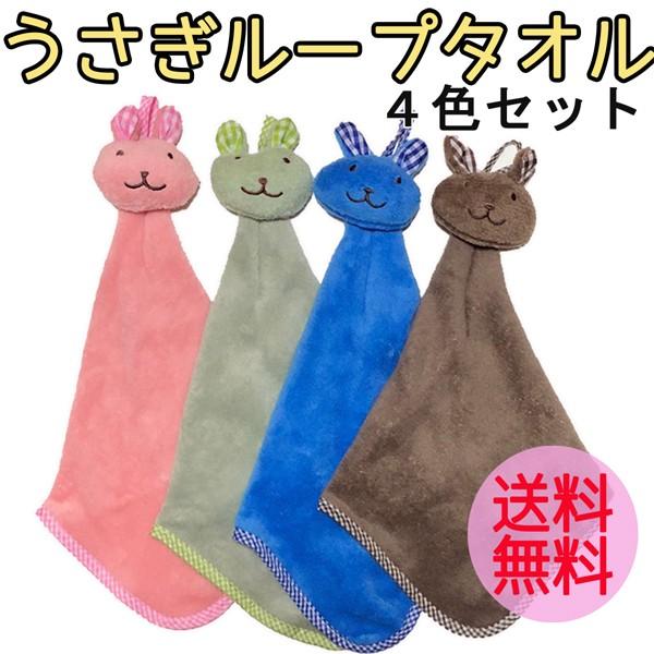 ループタオル うさぎ 4色セット ループ付タオル 子供用 室内用 台所 洗面所 トイレ( ミニタオル ハンドタオル )ひも付