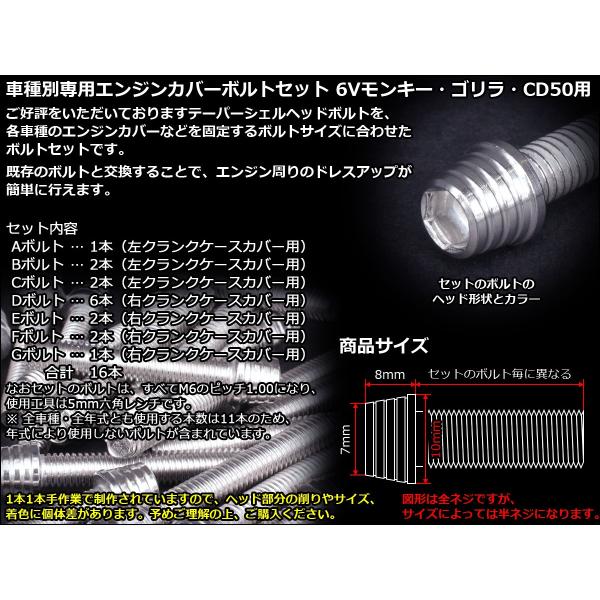 6Vモンキー ゴリラ CD50 エンジンカバー ボルト16本set キャップボルト テーパーシェルヘッド シルバー TB6076