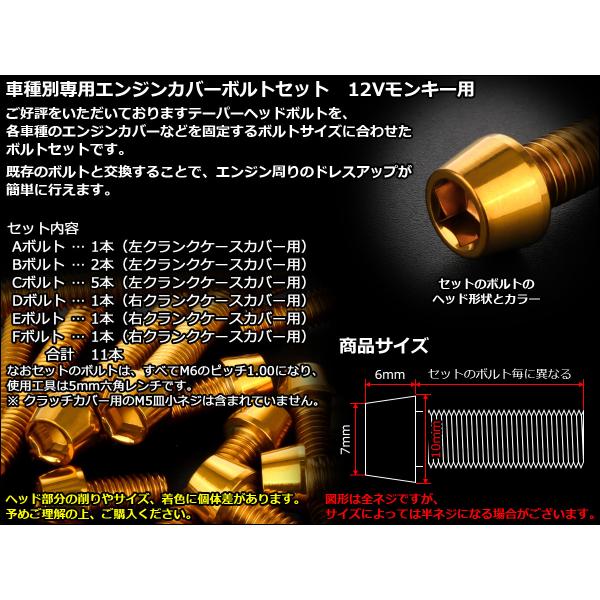 12Vモンキー エンジンカバー ボルト11本set キャップボルト テーパーヘッド ゴールド TB6114