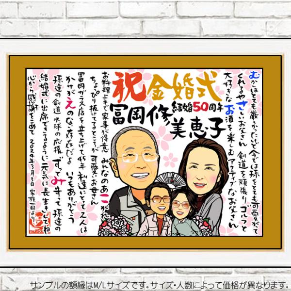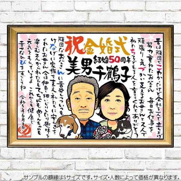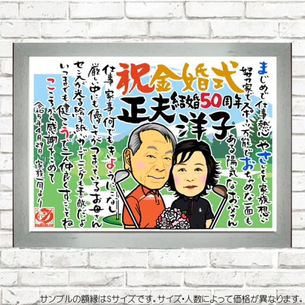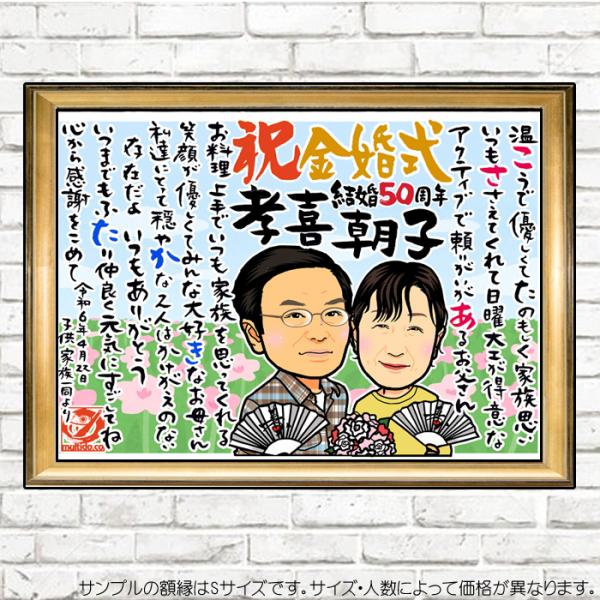 DF おしどり夫婦のディフォルメ似顔絵ポエム/結婚50周年のネームポエム入り似顔絵★金婚式 銀婚式 結婚記念日のお祝いプレゼント★両親似顔絵