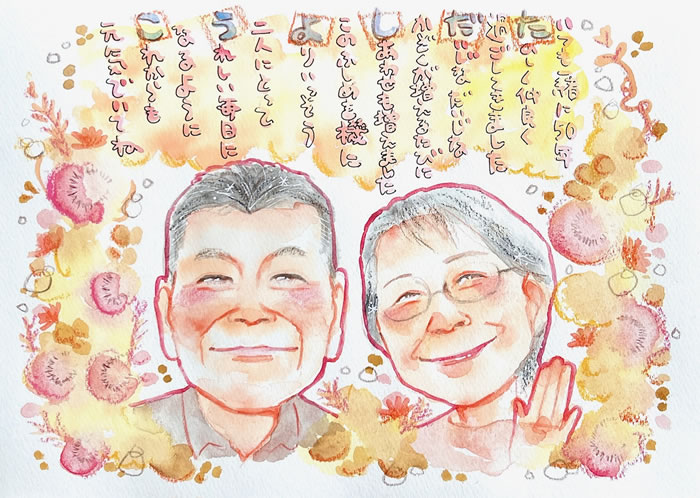 似顔絵 プレゼント 似顔絵ポエム イラスト 額縁 ネームイン お名前 退職祝い お祝い 父 母 両親 古希 還暦 女性 男性 金婚式 名前の詩「ほんわかウキウキ画」