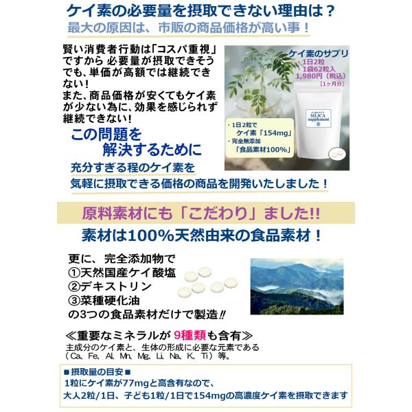 最新版 ケイ素のサプリ 1袋/1ヶ月分62粒入【国内製造】食品素材100%完全無添加のサプリメント!1粒に77mgのケイ素 爆買