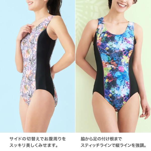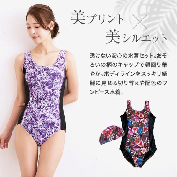 フィットネス水着 プリント 柄 ワンピース 水着 きれいに ミセス 40代 50代 ママ スイムキャップ セット