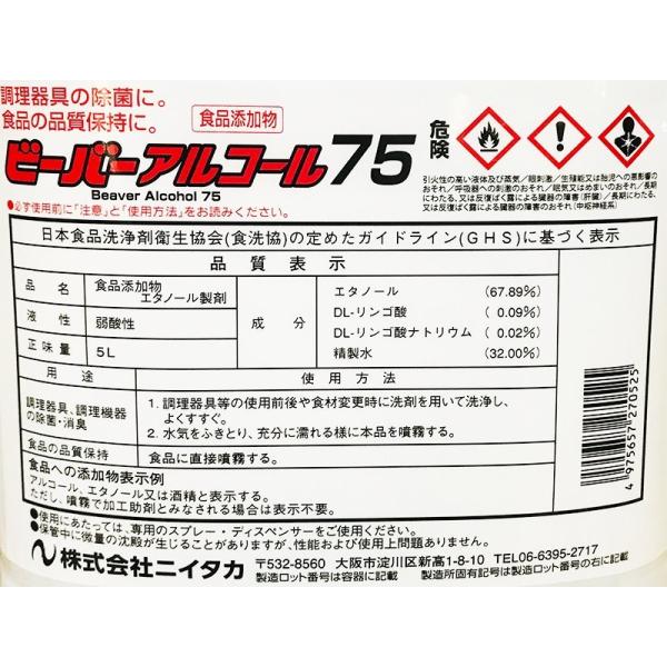 日本製 ニイタカ ビーバー アルコール 75 5L 除菌 消毒 エタノール 消毒 食品 キッチン 手 指 詰め替え アルコール 業務用 大容量 爆買