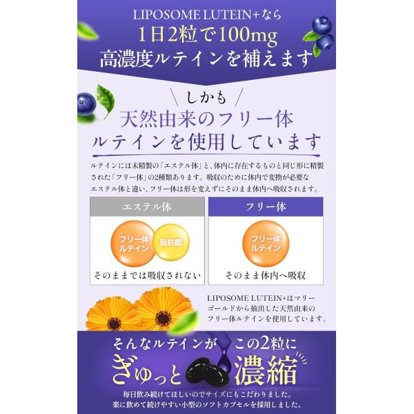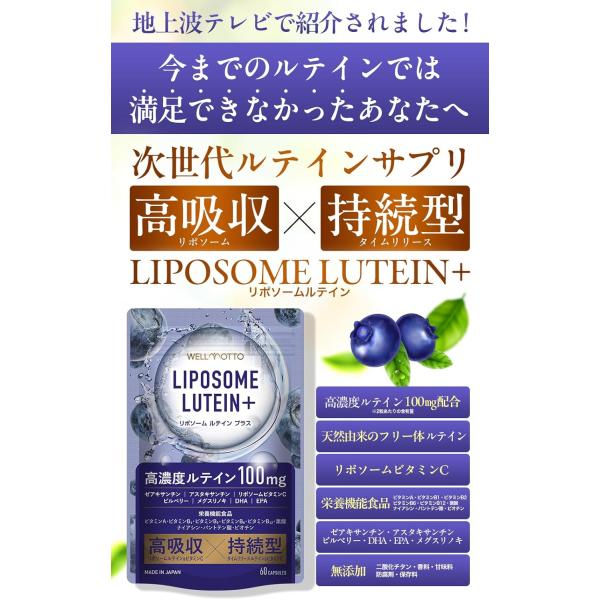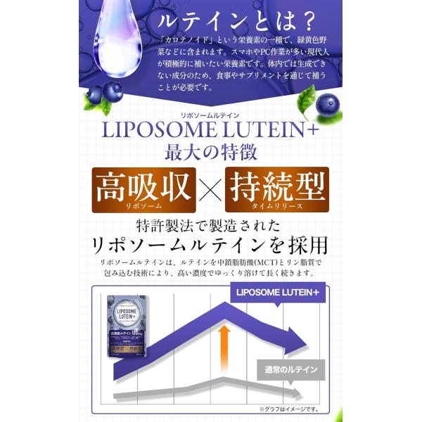 リポソーム ルテイン サプリ 高濃度 高吸収 持続型 LIPOSOME LUTEIN+ 2粒に100mg ゼアキサンチン ブルーベリー 栄養機能食品 60カプセル (30日分)