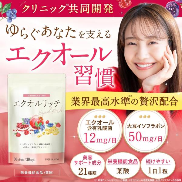 エクオルリッチ 栄養機能食品 エクオール含有乳酸菌 12mg イソフラボン 50mg えくおーる 国内製造 ビタミンB12 葉酸 GABA プラセンタ α-リポ酸 30日分30粒