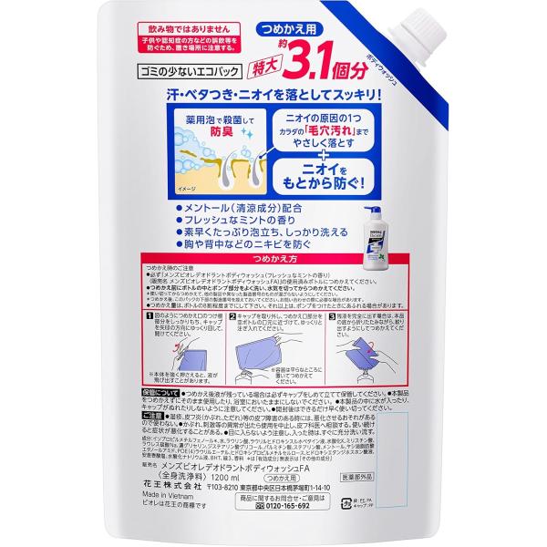 2個セット メンズビオレ 薬用デオドラント ボディウォッシュ フレッシュなミントの香り つめかえ用 1200ml