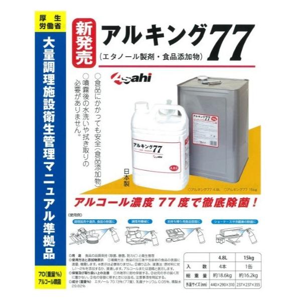 【個人宅配送・代引き 不可】1個・15kg・アルキング77 旭創業 食品添加物 業務用 エタノール製剤 除菌 アルコール消毒液 15kg(地域限定 送料無料)