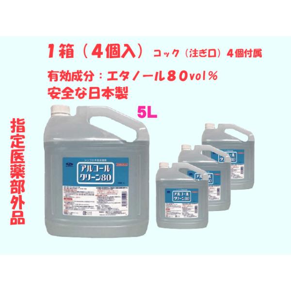 【4本セット】手指消毒用アルコール 日本製 アルコールクリーン80 5L 有効成分エタノール80.0vol% 70%以上 コック付き