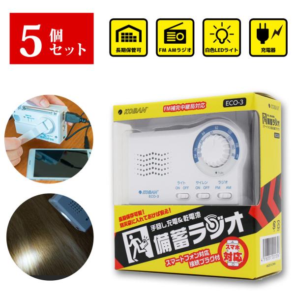 5個セット 未使用品 手回し充電 乾電池 備蓄ラジオ ECO-3 緊急 災害時 防災グッズ AM/FMラジオ 懐中電灯 LEDライト サイレン機能 携帯 スマホ充電 防災セット